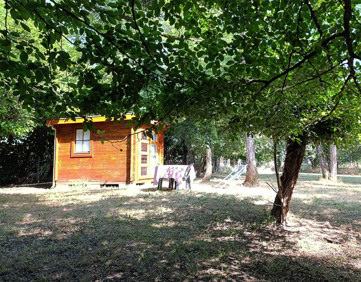 In the shade of acacia trees, in the heart of a private enclosed garden, you'll sleep under the trees in a wooden cabin surrounded by greenery, with breathtaking sunset views. In summer, you can enjoy the tranquility and spend the evening outdoors, and if you wish, sleep with the door open to enjoy the chirping of crickets, often accompanied by the hooting of an owl...